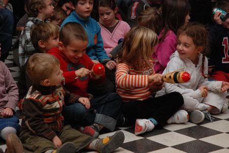 Les enfants sont invités à découvrir et utiliser leur voix (en imitant des sons d’animaux ou sur des refrains simples) ou des instruments (maracas, tambourins, xylophone,…) dans un échange joyeux et musical.